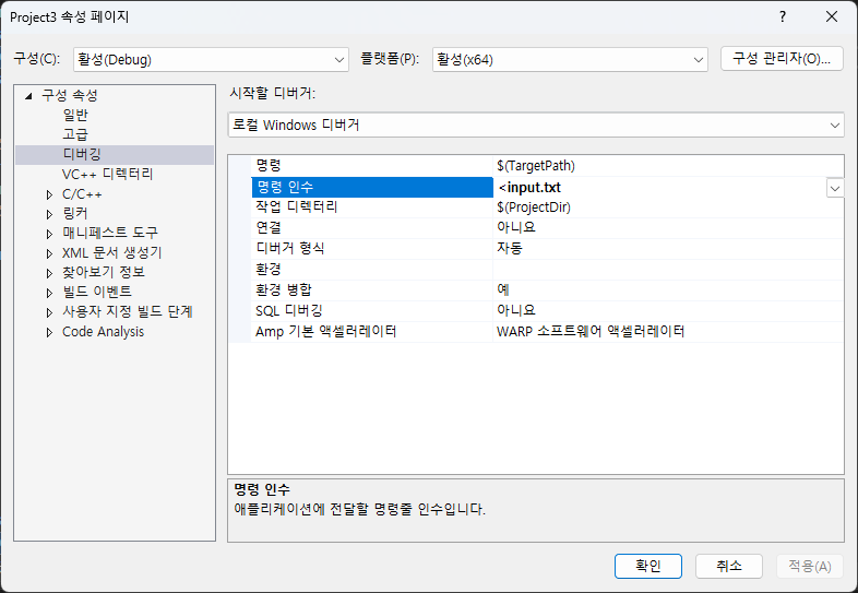 실행할 프로젝트 우클릭 > 속성 > 디버깅에서 명령 인수 란에 <input.txt를 입력한다.