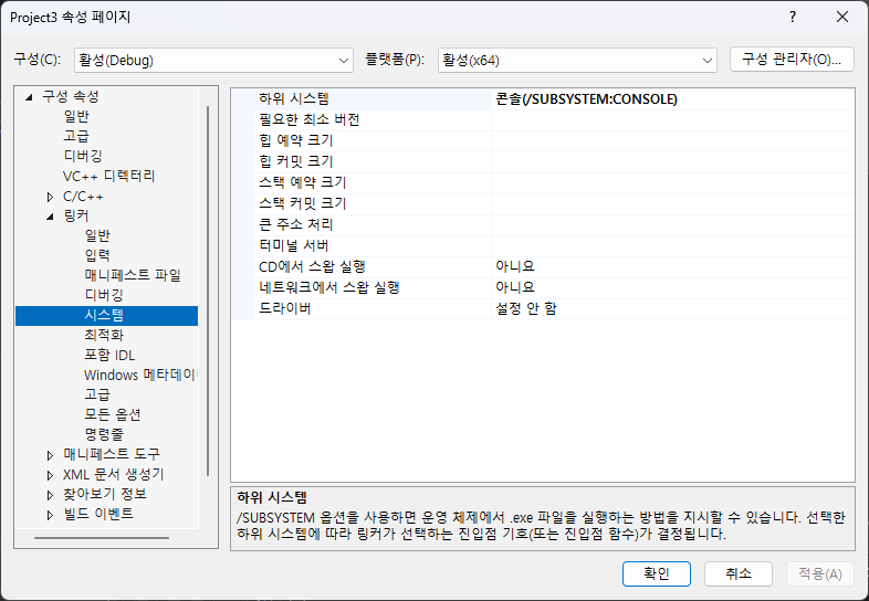 이 경우에 프로젝트 우클릭 > 속성 > 링커 > 시스템에서 하위 시스템을 콘솔(/SUBSYSTEM:CONSOLE)로 지정해준다.