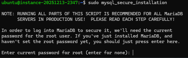 sudo mysql_secure_installationEnter current password for root (enter for none)→ 아직 설정된 root 비밀번호가 없으므로 바로 엔터를 눌러 넘어간다.