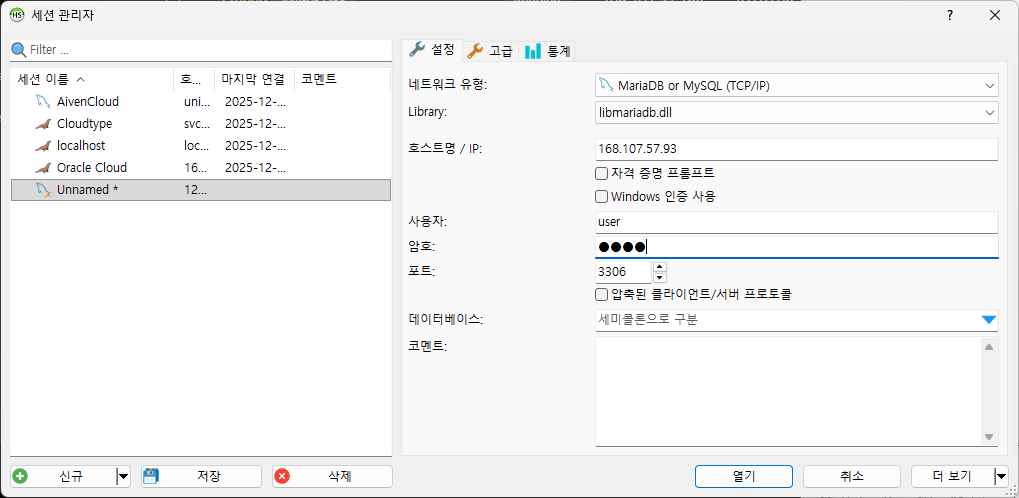 HeidiSQL같이 SQL에 접속할 수 있는 유틸리티에서 IP, 유저정보, 포트를 기입하고 접속한다.