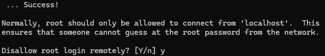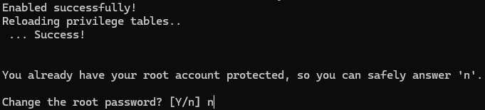 Change root password?→ N : root는 localhost만 접속 가능하므로 root 비밀번호를 설정하지 않고 넘어간다.